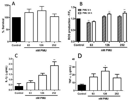 The method of [47] was followed. Cells were incubated with the calcium fluorophore probe Fluo-4 (Thermo Scientific, Eugene, OR, USA) at 6 µg/µL, for 45 min at 37 °C. After washing, the cells were incubated with HEPES (145 mM NaCl, 5 mM KCl, 2 mM CaCl2, 1 mM MgCl2, 5 mM HEPES) pH 7.4 (control), 63, 126 or 252 nM PMU. The fluorescence (excitation 488 nm/emission 530 nm) was read at 0 h (right after treatment), 6 h and 24 h, in a M2 spectrofluorometer (Molecular Devices, San Jose, CA, USA).