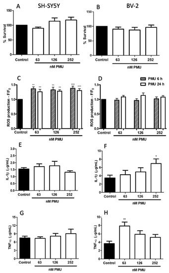 The neurotoxic potential of PMU was evaluated in cultured human neuroblastoma and murine microglial cells (Figure 4 and Figure 5). The MTT assay showed that, such as HEK293 cells, during the 24 h period of incubations with 63, 126, and 252 nM PMU, cell viability was not altered in both cell lines (Figure 4A,B).