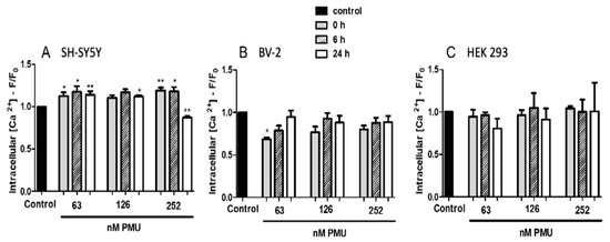 Levels of intracellular Ca2+ of cells cultured in the presence of PMU. Cultured (A) neuroblastoma, SH-SY5Y, (B) microglia, BV-2, and (C) kidney, HEK293, were incubated with the fluorophore calcium probe Fluo4 (0.33 mg/100 µL for 45 min), washed to remove the excess of the probe and then treated with PMU (63, 126, 252 nM) for 0, 6 or 24 h. Cells treated with NaPB 7.0 were taken as controls. The fluorescence (excitation 488 nm/emission 530 nm) intensity was then measured, and the values found for controls were considered as 1.0. The results are the mean ± SEM (n = 4 for the control and 4–5 for treatments). The data were analyzed by one-way parametric ANOVA with a Dunnett post-test. * p < 0.05 and ** p < 0.01 vs. control.