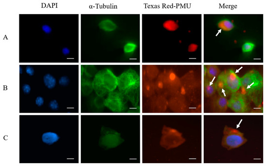 PMU (63 nM) or bovine serum albumin (BSA, 63 nM) was incubated with 0.5 mg/mL Texas Red (Sigma-Aldrich, St. Louis, MO, USA) for 1 h, at 4 °C, in the dark, with continuous stirring. The samples were then dialyzed against NaPB 7.0 to remove the free dye excess. Cell cultures were incubated with 63 nM Texas Red-labeled PMU or Texas Red-labeled BSA for 1 h at room temperature (r.t). After three washes with a buffer (30 min each, r.t), the cells were treated with 4% paraformaldehyde (10 min, r.t), incubated with ice-cold 100% methanol, and washed three times. After a blocking step (5% BSA, 0.3% Triton X-100) for 1 h at r.t., the cells were washed, and incubated with mouse anti-α-tubulin (Cell Signaling Technology, Danvers, MA, USA) diluted 1:1000 in PBS, 5% BSA, 0.1% Tween-20, for 1 h at r.t. Subsequently, the cells were washed three times and incubated with the secondary antibody (Alexa-Fluor 488-anti mouse, Molecular Probes Inc, Eugene, OR, USA) diluted 1:400 in PBS, 5% BSA, 0.1% Tween-20, washed three times, and stained with 300 nM DAPI (4′,6-diamidino-2-phenylindole) for 5 min. The cells were visualized under an inverted microscope Eclipse TE2000-S (Nikon, Tokyo, Japan) equipped with an ORCA-ER-1394 Camera (Hamamatsu Photonics K.K., Hamamatsu, Japan), with Phylum 4.2.0 (Improvision Inc., Lexington, MA, USA) as image acquisition software.