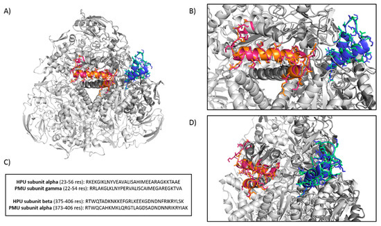 Nuclear localization sequences in P. mirabilis (PMU) and H. pylori (HPU) ureases. Panels (A–D) show the nuclear localization sequences (NSL) in P. mirabilis and H. pylori ureases. Panel (A) illustrates the 3D cartoon models of P. mirabilis urease in its (γβα)3 oligomer (light gray) superimposed to H. pylori urease in its (αβ)3 form (dark gray). The NLSs in PMU are pictured in orange (positions 22–54) and green (positions 575–608) and in HPU, they are shown in pink (positions 21–56) and blue (positions 613–646). The sequences corresponding to the NLS are presented in panel (C). Closer views of the two bipartite NLSs present in HPU and PMU are seen in Panels (B,D) (90 degree turn). Images were built with PyMOL.