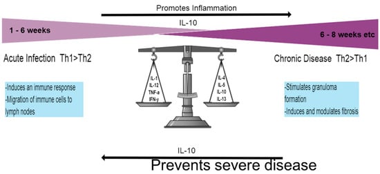 Th1 and Th2 responses. The initial response once infected by the schistosome parasite lasts for ~6 weeks and is dominated by the Th1 response, characterized by pro-inflammatory cytokines. Once the adult worms lay eggs and release SEA, the Th2 response sets in, largely driven by IL-4 and IL-13. Chronic disease requires formation of the granuloma and digresses into liver fibrosis. The Il-10 cytokine represents an important element in disease progression by encouraging inflammation through down-regulation of the Th1 response but also preventing severe disease during the Th2 response.