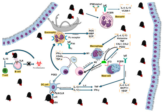 Effector cell activation during schistosome infection. The presence of inflammatory cells in the form of lymphocytes (B and T cells), macrophages, eosinophils, dendritic cells, mast cells, and basophils all play crucial roles in schistosome disease progression. Various receptors and cytokines drive their functions, which may sometimes overlap but are all the same interconnected.