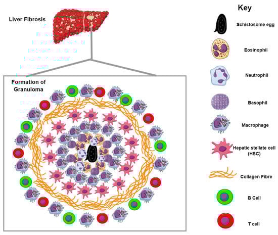 In schistosomiasis, the presence of the above-mentioned inflammatory cells gives rise to the distinctive egg-induced granuloma, which is detrimental to the host because of developing fibrosis and portal hypertension, but simultaneously helps the host survive with infection for several years [74]. It does so by providing a potent shield between toxic egg secretions and the host’s tissues. Interaction between these has proven fatal, as has been shown in immunocompromised mouse models, thus it presents itself as a compromise for infection.