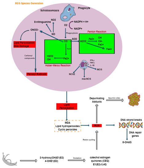 Oxidative stress in schistosomiasis is accompanied by mediated site-specific tissue damage such as in the liver, especially at sites of granulomatous inflammation, owing to the production of ROS by macrophages and eosinophils [118]. Lipid peroxidation occurs, damaging antioxidant systems set in place for ROS scavenging; this in turn results in peroxidative impairment of lipids found in the liver [119]. Lipid peroxidation is a complex reaction that that has been associated not only with disease progression but also with the inflammatory process, which involves the oxidation of lipids and polyunsaturated fatty acids to produce malondialdehyde, lipid hydroperoxides, and cyclic peroxides. Such products generated via lipid peroxidation, which are extremely genotoxic and mutagenic, react with DNA and induce damage [109]. Oxidative stress in general stimulates pathways that damage cell structure and function, thus linking it to the initiation and progression of cancer by inducing DNA mutations and damage and causing cell proliferation and genome instability [120]. S. haematobium has been mentioned frequently to be classified as a Group 1 carcinogen by the World Health Organization and the International Agency for Research on Cancer in response to reports on the disease predisposing infected individuals to carcinomas such as squamous bladder cancer [20]. ROS released by inflammatory cells causes DNA-strand breaks, sister chromatid exchanges, as well as mutations. It has been shown that schistosomal infection and subsequent inflammations result in the generation of free radicals, which become oxidized, causing single-strand breaks in DNA. Because of this complication, 8-hydroxy-2′-deoxyguanosine (also known as 8-OHdG), which is a well-known biomarker of oxidative stress, increases owing to the presence of DNA-repair genes such as deoxy8-oxyguanine-DNA-glycosylase as well as apurinic/apyrimidinic endonuclease [121]. Other studies have also indicated that nitrative stress generated by NO forms 8-nitroguanine [122]. Another notable way in which oxidative stress in schistosomiasis causes DNA damage can be explained by the estrogen-DNA adduct mediated pathway. Estrogen-like metabolites secreted by S. haematobium worms and eggs are highly genotoxic as a result of catechol estrogens such as 2-hydroxy(OH)E1(E2) and 4-OHE1(E2) oxidizing to form catechol estrogen quinones and semiquinones such as E1(E2)-3,4Q [123,124]. This results in redox cycling and the production of ROS, which react with DNA. Depurinating adducts form, resulting in the generation of apurinic sites, which have the potential to become mutagenic over several cell generations, eventually becoming cancerous [23,124]. In addition to cancer, mutations generated by apurinic sites are linked to autosomal recessive infertility.