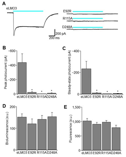 Mutant luminopsins with negligible photocurrent without altering expression levels. (A) Representative photocurrent traces to photostimulation (cyan bars) obtained from (HEK) 293FT cells expressing a different luminopsin indicated. The scale bars apply to all the traces. (B) Peak photocurrent. Asterisks (*) indicate significant differences from the wildtype eLMO3 (see text). Error bars indicate SEM in this and subsequent figures. N = 6 cells each. (C) Steady-state current measured in the period where photocurrent was inactivated during photostimulation. Asterisks indicate significant differences from the wildtype eLMO3 (see text). (D) Bioluminescence measured with 50 µM CTZ using a plate reader. N = 22, 11, 12, and 12 wells, respectively. (E) Fluorescence measured using a YFP filter cube. N = 24, 12, 12, and 12 wells, respectively.
