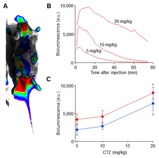 We observed various amplitudes and time courses of bioluminescence following injection of different doses of CTZ in dose-dependent manners (Figure 3B). Bioluminescence reached its peak within 5 to 40 min after injection and decayed gradually in the next hour or so. We observed a significant dose dependency in the amplitude of bioluminescence (Figure 3C; * p = 0.01; two-way ANOVA; F(2,12) = 6.75; n = 3 each for males and females). Although bioluminescence amplitude was slightly greater in males than in females, based on the results of our two-way ANOVA, we found no significant sex difference and also found that no significant interaction between sex and amplitude was present (p > 0.05; two-way ANOVA; F(1,12) = 4.74, F(2,12) = 0.27, respectively; n = 3 each for males and females). Bioluminescence with the highest dosage tested (20 mg/Kg) was significantly higher than the lower two dosages (5 and 10 mg/Kg; * p < 0.04; Tukey’s multi comparisons; q(3,15) > 3.87; n = 6 mice (3 males and 3 females)).