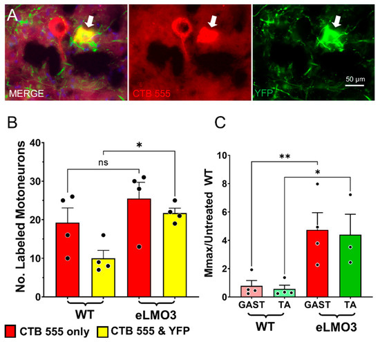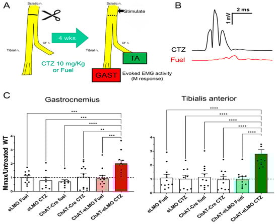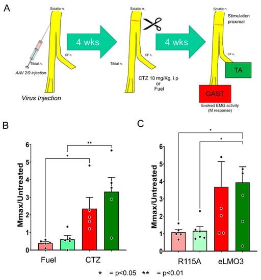 Ten sciatic nerves from SLICK-A mice (six male, four female) were injected with a viral vector encoding a Cre-dependent eLMO3 construct (Figure 6A). Recombination through inducible Cre recombinase was then induced by tamoxifen treatment to express eLMO3 in a subset of motoneurons. Four weeks after transection and repair of the sciatic nerve, and treatment with either CTZ (10 mg/Kg, i.p.) or Fuel, M responses were recorded from the reinnervated GAST and TA muscles. Amplitudes of Mmax were scaled to those recorded from untreated animals [19]. Results of comparison of CTZ-treated and Fuel-treated animals are shown in Figure 6B. A one-way ANOVA applied to these data returned a significant result (p < 0.003, F(3, 16) = 7.172). In post hoc paired testing, significant differences between the two treatment groups were found for both muscles (Figure 6B). BL-OG treatment in the motoneurons induced to express eLMO3 resulted in enhanced motor axon regeneration and muscle reinnervation.