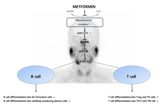 - Lee, S.Y.; Moon, S.J.; Kim, E.K.; Seo, H.B.; Yang, E.J.; Son, H.J.; Kim, J.K.; Min, J.K.; Park, S.H.; Cho, M.L. Metformin Suppresses Systemic Autoimmunity in Roquin(san/san) Mice through Inhibiting B Cell Differentiation into Plasma Cells via Regulation of AMPK/mTOR/STAT3. J. Immunol. 2017, 198, 2661–2670. [Google Scholar] [CrossRef] [Green Version]