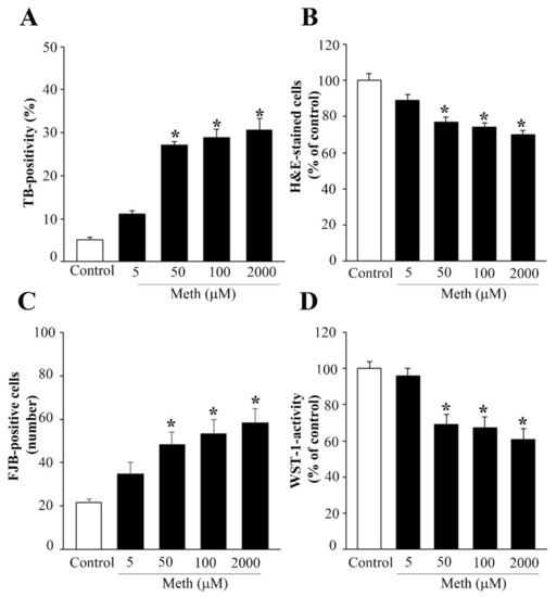 Dose–response curve for Meth-induced toxicity. A wide range of doses of Meth (5 μM, 50 μM, 100 μM, 1 mM, 2 mM) was administered to PC12 cells for 72 h. (A) Graph for TB-stained cells; (B) graph of H&E-stained cells; (C) graph of FJB-stained cells; (D) graph of WST-1 viability assay. While the lowest dose of Meth (5 μM) did not produce any decrease in cell viability compared with controls, Meth administration from the dose of 50 μM up to the dose of 2 mM produces a significant cell loss compared with controls, which was detected for each staining procedure. In detail, at 50 μM, the loss of cell viability already reached a plateau, since no further increase in toxicity was observed by using any procedure up to the dose of 2 mM. Data are given as the mean ± SEM of nine independent counts for TB and WST-1, and six independent counts for H&E and FJB. Inferential statistics was carried out with ANOVA with Scheffè’s post hoc analysis. (DF = 4). * p < 0.05 compared with controls.