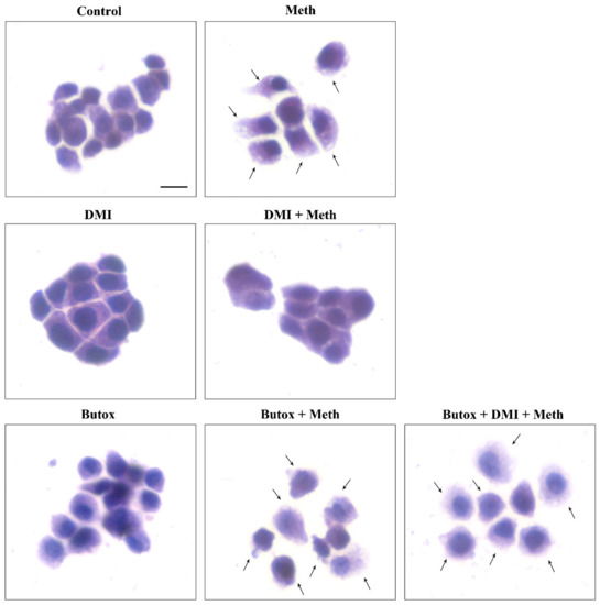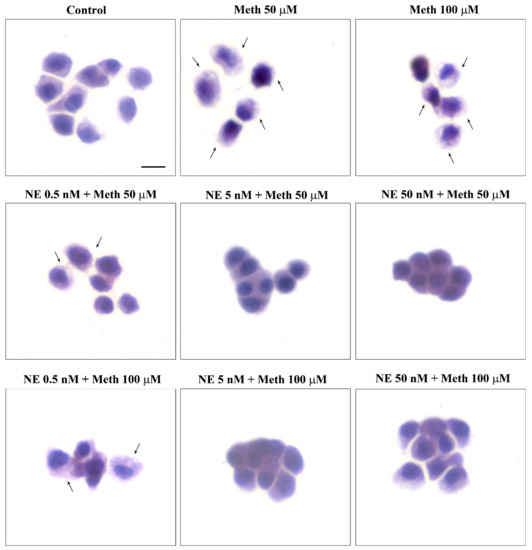 NE does protect against Meth toxicity (H&E staining). Representative pictures show NE protection against Meth-induced toxicity. The protective effects of NE are evident both at the dose of 5 nM and 50 nM administered to cells treated with Meth either at the dose of 50 μM or 100 μM. The toxic effects of Meth are detectable in spared cells as pale eosinophilic cytosol (arrows) where damaged cells are abnormal in size and shape. Scale bar = 8 μM.