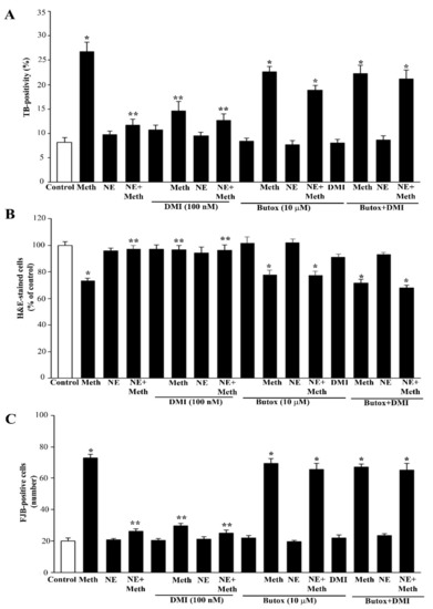 In line with this, the protective effects of NE and DMI did not cumulate, which indicates a similar mechanism of protection, which is saturated either by NE (5 nM) or DMI (100 nM) (Figure 7). Consistently, the selective β2-AR antagonist butoxamine fully suppresses the protective effects of both DMI and NE on Meth-induced toxicity. These findings are consistent along various procedures (TB, H&E, FJB, Figure 7A–C and Figure 9), which indicates that NE-induced protection is fully based on the activation of plasma membrane β2-ARs.
