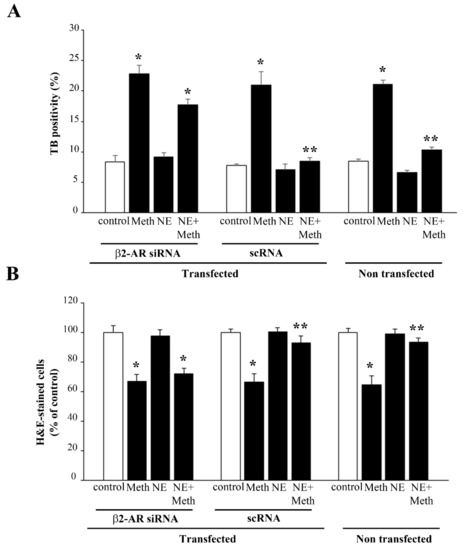 Meth-induced FJB fluorescence is not reduced by NE after transfection with β2-AR siRNA. (A) Representative pictures and FJB fluorescent cells showing the effects of Meth and NE in naïve and β2-AR siRNA- and scRNA-transfected cells. (B) The graph reports the number of FJB fluorescent cells in the different experimental groups. (DF = 11) * p < 0.05 compared with control; ** p < 0.05 compared with Meth. Scale bar = 13.3 μM.