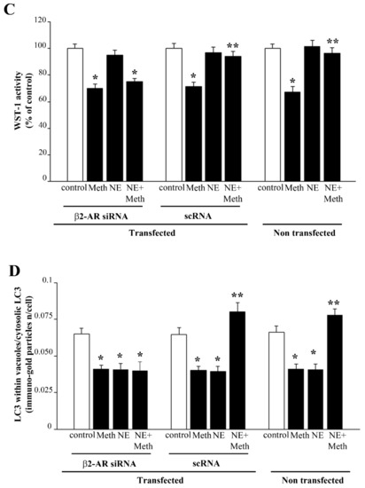 Transfection with β2-AR siRNA suppresses the protective effects of NE against Meth. Cell viability in naive and β2-AR siRNA- and scRNA-transfected cells, as evaluated by (A) TB, (B) H&E, and (C) WST-1 assay. (D) Dissipation of LC3 particles from vacuoles to the cytosol in β2-AR silenced cells. (DF = 11) * p < 0.05 compared with control; ** p < 0.05 compared with Meth.