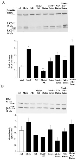 Opposite effects of NE and the β2-AR antagonist butoxamine on the LC3-II and p62 accumulation induced by Meth. Western blot for the autophagy markers LC3-I and LC3-II (A) and p62 (B) are reported along with the related optical densities. (DF = 7). * p < 0.05 compared with controls; ** p < 0.05 compared with Meth. Ctrl = control.
