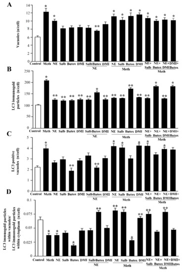 2.5. NE Counteracts Meth-Induced Dissipation of LC3 from Autophagy Vacuoles
