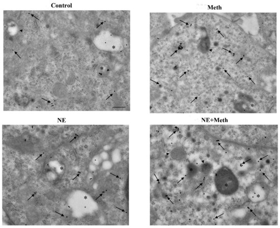 Representative TEM micrograph of LC3 compartmentalization following NE and Meth (high magnification). Representative TEM micrographs at high magnification of Control, Meth (50 μM), NE (5 nM), or NE (5 nM) + Meth (50 μM)-treated cells. Images show autophagy-like vacuoles (arrowhead); autophagy vacuoles (asterisk for LC3); and cytosolic LC3 particles (arrow pointing 20 nM immunogold particles). Cells were fixed for TEM analysis 72 h after Meth administration. In the combined treatment, NE was administered 30 min before with Meth. Scale bar = 200 nM.