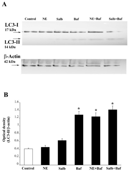NE and the β2-AR agonist salbutamol do not counteract the inhibition of the autophagy flux produced by bafilomycin. Western blot for LC3-I and LC3-II (A) and related optical density (B) are reported. (DF = 5). * p < 0.05 compared with controls.