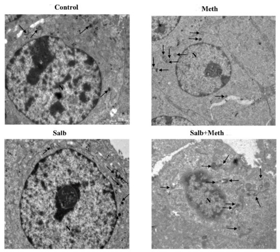 Representative TEM micrograph of autophagy-like vacuoles following salbutamol and Meth (low magnification). TEM micrographs at low magnification of Control, Meth (50 μM), salbutamol (5 nM), or salbutamol (5 nM) + Meth (50 μM)-treated cells. Images show autophagy-like vacuoles (arrow). Cells were fixed at 72 h after Meth administration. In the combined treatment, salbutamol was administered 30 min before with Meth. Scale bar = 1 μM. N = nucleus.