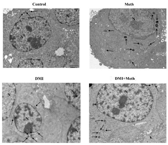 Representative TEM micrograph of autophagy-like vacuoles following DMI and Meth (low magnification). Representative micrographs of Control, Meth (50 μM), the selective NET blocker DMI (100 nM), or DMI (100 nM) + Meth (50 μM)-treated cells. Cells were fixed at 72 h after Meth administration. In the combined treatment, DMI was administered 45 min before Meth. Autophagy-like vacuoles are shown (arrow). Scale bar = 1 μM. N = nucleus.