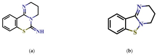 Structures of 3,4-dihydro-2H,6H-pyrimido[1,2-c][1,3]benzothiazin-6-imine (a) and 3,4-dihydro-2H-benzo[4,5]isothiazolo[2,3-a]pyrimidine (b).