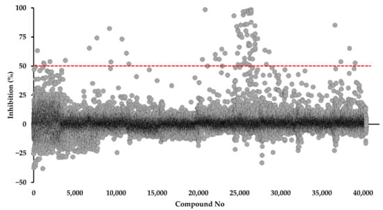 Screening of 40,400 compounds from Kyoto University chemical library against PfDHODH. The screening was performed at a final concentration of 4.5 μM. The dashed line represents the 50% inhibition threshold for the selection of hits.