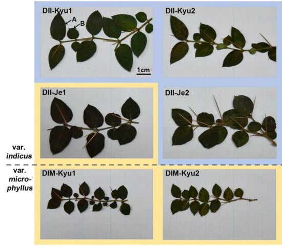 The morphology of six individuals of Damnacanthus indicus. A dashed horizontal line represents the division between var. indicus (upper four) and var. microphyllus (lower two). Each individual is marked with its acronym (see Table 1). D. indicus is heterophylly with relatively large and small leaves alternately appearing and characterized by a length of spines that is more than half the length of the leaves. The heterophyllous leaves in DII-Kyu1 are indicated (A = large, B = small). D. indicus is divided into two varieties according to leaf length; var. indicus has a leaf length of 1–2 cm and var. microphyllus has a leaf length of 0.5–1 cm. According to our observations, var. microphyllus is conspicuously smaller than var. indicus in the size of the leaves, the height of the plant and the length of the spines. The colored boxes represent the phylogenetic distinction; the blue part is cluster1 and the yellow network is cluster2. Each image size is equal to 8x5 cm. Scale bar = 1 cm.