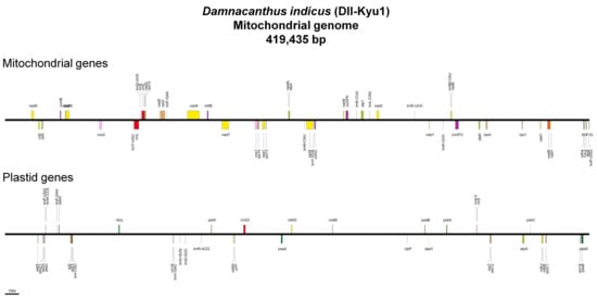 Maps of a representative mitochondrial genome (DII-Kyu1) of Damnacanthus indicus. Two maps showing genes of mitochondrial and plastid origins are presented, respectively. Annotations include only intact mitochondrial genes, while for plastid genes, those also include fragmented copies.