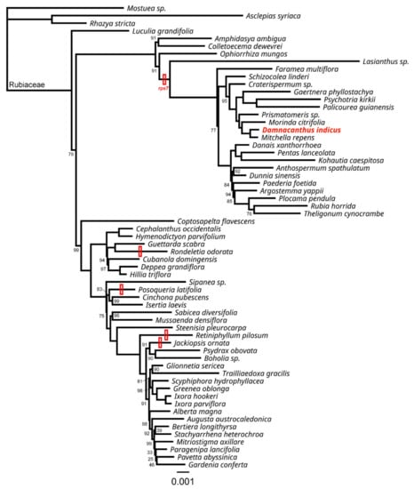 Maximum likelihood phylogeny of Rubiaceae based on concatenated mitochondrial genic regions (40,810 bp in the aligned length). Bootstrap values that are not 100 are shown at the nodes. The scale indicates the number of nucleotide substitutions per site. Branches leading to taxa or taxon with rps7 loss are marked with empty red bars. The newly sequenced mitogenome of Damnacanthus indicus is highlighted with red font.