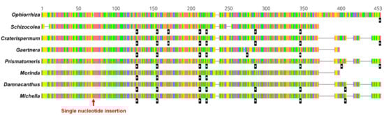 To understand the gene loss pattern of rps7, we reconstructed a phylogenetic tree for the Rubiaceae (Figure 3). There was no rps7 copy for 18 taxa, while 7 taxa showed pseudogenization among 58 Rubiaceae taxa. Among 25 taxa, 4 (Rondeletia odorata, Posoqueria latifolia, Retiniphyllum pilosum and Jackiopsis ornata) showed signals of gene loss of rps7 and did not form a monophyletic group. However, the rest of the 21 taxa belonged to a highly supported clade (100 bootstrap value), defined by the most recent common ancestor of Lasianthus sp. and Theligonum cynocrambe. All seven pseudogenized copies of rps7 were found in this clade. These seven copies showed multiple premature stop codons along with several indels and truncations at 3′ sites, compared to Ophiorrhiza mungos (Figure 4). The characteristic shared by all pseudogenized copies was a single nucleotide (A) insertion, making the reading frame shift from the 5′ site.