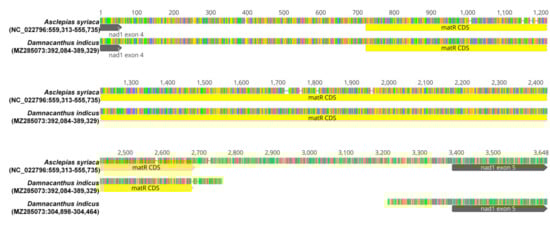 The nad1 exon4-nad1i728 (including matR)-nad1 exon5 region of Asclepias syriaca (NC_022796.1) and its corresponding two regions of D. indicus (DII-Kyu1) were aligned with MAFFT using default options.