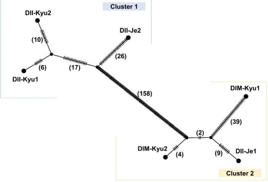 Intra-specific mitochondrial DNA divergence in D. indicus is analyzed in Figure 7. The analysis broadly divided six individuals into two subgroups, diverged by 158 mutational steps. This subgrouping did not support infraspecific classification since two individuals of Jeju Island were divided. DII-Je2 was grouped with other individuals of var. indicus, while DII-Je1 was close (15 mutational steps) to DIM-Kyu2 of var. microphyllus.