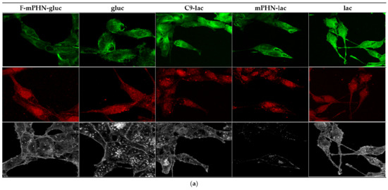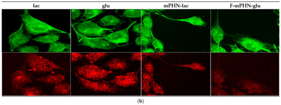 In the case of the HTB140 cell line, the situation was different (Figure 3b). It was clearly visible that for these cells the general circularity index of the organelle was lower and in the range 0.5–0.75, which is normal for elongated melanoma nuclei and usually associated with changes in cytoskeleton architecture and focal adhesion appearance [36]. These changes correlated with subtle alterations of in microtubules and intermediate filaments observed in microscope (Figure 2). After the first 24 h from the start of cultivation the highest circularity index was presented by cells with C9-lac and mPHN-lac. The smallest round nuclei were found in cells cultured with glucose, galactose, mPHN and F-mPHN sodium salts. The changes of the nuclei shape caused by the compounds were more significant after the next 24 h. The changes occurred in almost all cell groups and a decrease in roundness index was observed in each case. The biggest change occurred in a presence of C9-lac esters, mPHN-lac and F-mPHN-lac.