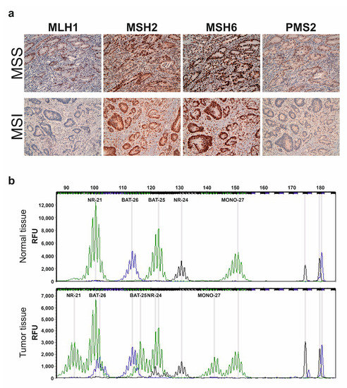 Representative IHC staining for MMR proteins and electropherograms of multiplex PCR analysis using the MSI Analysis System Version 1.2 kit. (a) MLH1, MSH2, MSH6 and PSM2 expression in FFPE samples of a MSS and a MSI patient by IHC (original magnification 20×). The MSS patient shows normal expression of all MMR proteins. Deficiency in MLH1 and PSM2 proteins is observed in the MSI patient; (b) Multiplex PCR electropherograms show profiles of 5 quasimonomorphic microsatellites (NR-21, BAT-26, BAT-25, NR-24 and MONO-27) in the normal and tumor tissue of the same patient. The tumor tissue shows additional peaks that are absent in the normal tissue of all microsatellites analyzed, revealing an MSI profile.