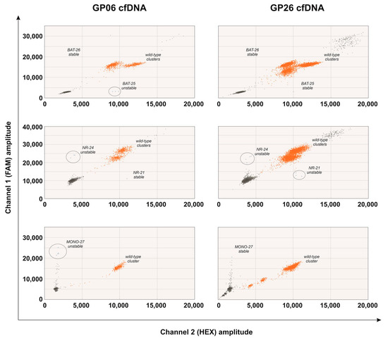 Two-dimensional plot of droplet fluorescence for the three ddPCR MSI assays (BAT-25 and BAT-26; NR-21 and NR-24 and MONO-27) performed in the cfDNA of patients GP06 and GP26. Wild-type molecules are in the orange clusters, and the microsatellite unstable molecules are in the blue clusters. The individual target is labeled on each plot. Circles identify loci with at least three positive droplets (unstable loci).
