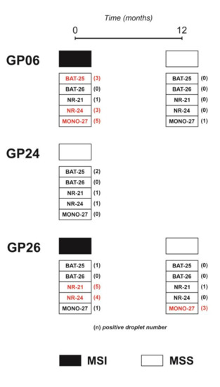 MSI status in cfDNA samples of GP06, GP24 and GP26 prospective patients. Black and white rectangles indicate MSI or MSS status, respectively. Unstable microsatellites are shown in red and the number of positive droplets is indicated in brackets.