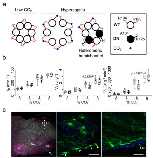 The functional effects of this CO2-sensitivity have been studied via an innovative method that used two mutations (K125R and R104A) in the Cx26 gene to create a dominant negative subunit (dnCx26, Figure 1a). These mutations ensure that the dnCx26 subunit can neither bind CO2 nor interact with a neighbouring subunit that has bound CO2. It has been shown by FRET to co-assemble with wild-type Cx26 and result in heteromeric hemichannels that are unable to change conformation and open in response to CO2 []. Therefore, it provides a method to remove CO2 sensitivity from Cx26 without deleting the gene and, thus, other potential functions of Cx26 (Figure 1a).