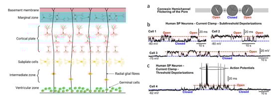 - Moore, A.R.; Zhou, W.-L.; Sirois, C.L.; Belinsky, G.S.; Zecevic, N.; Antic, S.D. Connexin hemichannels contribute to spontaneous electrical activity in the human fetal cortex. Proc. Natl. Acad. Sci. USA 2014, 111, E3919–E3928. [Google Scholar] [CrossRef] [Green Version]