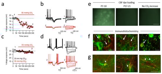 CO2 sensitivity of dopaminergic neurons in the substantia nigra alters across development. (a) Changes in voltge responses to hyperpolarising current steps for a neuron from a P7-10 mouse when CO2 was increased from 35 to 55 mmHg (red). (b) Associated voltage traces (40 superimposed traces) in response to step currents (from −200 pA to 50pA) at the indicated time points from a. (c) There was no significant change in the voltage response to hyperpolarising current steps in a dopaminergic neuron from a P17-21 mouse when CO2 was changed from 35 to 55 mmHg. (d) Associated voltage traces (40 superimposed traces) and voltage responses to step currents at indicated time points from c. (e) Carboxyfluorescein (CBF) dye loading following hypercapnia (55 mmHg CO2) in P7-10 mouse slices. No dye loading occurred if CO2 was not changed or if CO2 was increased in P17-21 slices, scale bar = 50 µm. (f) Immunofluorescent staining of P7-10 SN for Cx26 (red, arrows) in TH+ neurons (green) in single optical planes, scale bar = 20 µm. (g) Immunofluorescent staining of P17-21 SN for Cx26 (red, arrows) in glial fibrillary acidic protein (GFAP; green) in single optical planes, scale bar = 50 µm. Adapted from [].