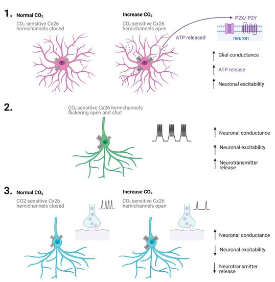 CO2-sensitive connexins are widely expressed across the brain in astrocytes (Cx26 and Cx30) or oligodendrocytes (Cx32) [,] rather than neurons. While the function of the CO2-sensitivity of Cx30 and Cx32 remains unexplored, Cx26 is an important CO2 chemosensor involved in the control of breathing. CO2-dependent ATP release is an important mechanism that mediates adaptive changes in ventilation during hypercapnia [,]. This ATP release occurs at least in part through Cx26 hemichannels, which are expressed in glial cells at the surface of the medulla oblongata [].
