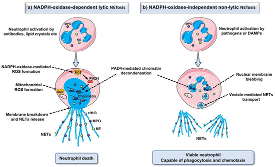Mechanisms of NET formation. (a) NADPH-oxidase (NOX)-dependent lytic NET formation: After activation, neutrophils produce reactive oxygen species (ROS) via the NADPH-oxidase complex. ROS activates or upregulates protein-arginine deaminase type 4 (PAD4, which promotes citrullination of histones and subsequent chromatin de-condensation). Myeloperoxidase (MPO) helps translocate neutrophil elastase (NE) into the nucleus, which leads to further chromatin de-condensation, finally the nuclear membrane is disrupted, and NETs decorated with granular and cytosolic proteins are released in extracellular space. Neutrophils die after NET formation. (b) NADPH-oxidase (NOX)-independent non-lytic NET formation: After neutrophils activation by pathogens or DAMPs, PAD4 promotes chromatin de-condensation. NETs decorated with granular and cytosolic proteins are released outside via vesicular transport without plasma membrane disruption. After the release of NETs, neutrophils remain viable, and capable of phagocytosis and chemotaxis.