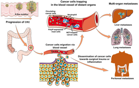 NET-mediated CRC progression and metastasis. KRAS mutation induces colon cancer cells proliferation and migration through the blood vessel. IL-8 secretion by circulating cancer cells or transfer of mutant KRAS to neutrophils via exosomes provoke NET formation in blood vessel of distant organs. Mast cells expressing polyphosphates (polyP) stimulate neutrophils and produce NETs. NETs trap cancer cells in distant organs such as in the liver and lung and thus, help metastatic spread. Spontaneous dissemination of colon cancer cells towards peritoneal wounds or inflammation and subsequent attachment to the inflamed peritoneum promote peritoneal metastases.