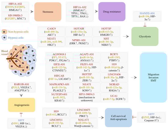 Although lncRNAs whose expression is affected by hypoxia/HIFs can exert diverse cellular effects, lncRNAs are subdivided into five groups in an attempt to present the crucial function of each lncRNA.
