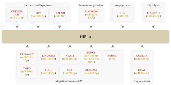 As was the case in Section 2, we classified HIF-1α-regulating lncRNAs into six categories depending on what lncRNAs are involved in cellular events, aiming to display the function of each lncRNA even though they can have multiple functions.