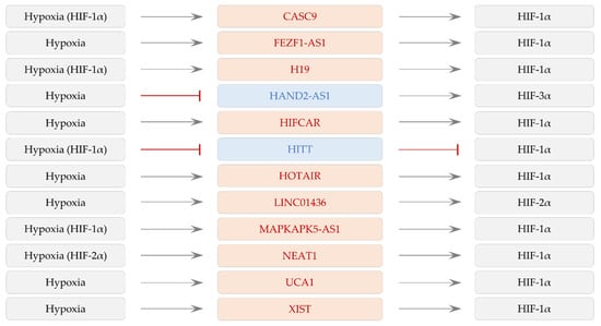 LncRNAs modulating the level of HIF-1α. Rounded rectangles represent lncRNAs (red). Rounded brackets denote cellular factors (proteins and miRNAs) involved in lncRNA-mediated HIF-1α regulation. Positive regulation is shown by an arrow.