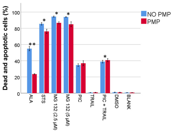 We have previously demonstrated that PMPs increase resistance to DNR-induced apoptosis and cell death [52]. To investigate whether co-incubation with PMPs provided a general anti-apoptotic effect, we compared apoptosis and cell death after treatment with several agents associated with inducing apoptosis, primarily through intrinsic (alantolactone, staurosporine, MG 132), or extrinsic (piceatannol, TRAIL) apoptosis. Co-incubation of PMPs with THP-1 cells decreased the relative frequency of dead and apoptotic cells induced by alantolactone, staurosporine, and MG 132, but not piceatannol (Figure 1). In our experiments 50 ng/mL TRAIL was not sufficient to induce apoptosis in THP-1 cells, but it slightly potentiated the apoptotic effect of piceatannol. Surprisingly, PMP co-incubation increased the relative frequency of dead and apoptotic cells in the case of the combination of piceatannol and TRAIL (p = 0.003). However, as this effect was marginal (mean difference of 1.89 percentage points; SD 0.43), it could be biologically insignificant. From these analyses, we suggest that PMPs may provide general protection from apoptosis, but seemingly only against agents that primarily activate the intrinsic apoptotic pathway.