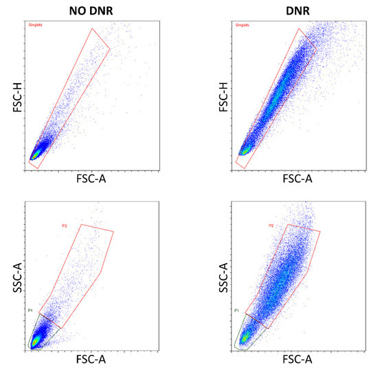 Gating strategy for intracellular flow cytometry of BCL2-family proteins. Doublets were first discriminated in FSC-A vs. FSC-H plots. P1 represents the population of daunorubicin (DNR)-treated cells gated in FSC-A vs. SSC-A plots that aligned well with non-DNR-treated cells. P2 represents a population generated by DNR-treatment and with increased light scatter.