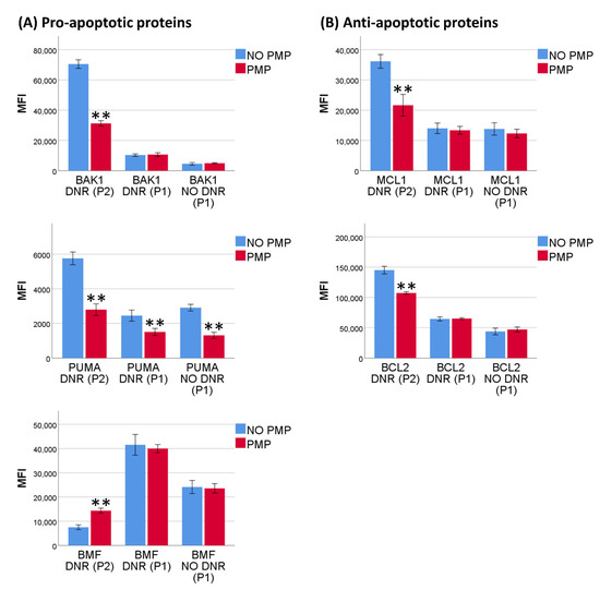 Levels of BCL2-family proteins before and after daunorubicin treatment. (A) THP-1 cells were co-incubated with or without platelet microparticles (PMPs) for 24 h before treatment with or without 0.5 µM daunorubicin (DNR) for an additional 24 h. Cells were then analyzed by intracellular flow cytometry. Data were collected as mean fluorescence intensity (MFI) levels corrected for a “no primary antibody” sample of pro-apoptotic BCL2-family proteins (n = 5). P1 represents the population determined by viable DNR untreated cells, but also visible in DNR-treated cells, with minimal changes of protein expression. P2 represents the population generated by DNR-treatment. (B) MFI levels corrected for a “no primary antibody” sample of anti-apoptotic BCL2-family proteins (n = 5). Data were compared using the paired-sample t-test for data pairs. ** p < 0.001.