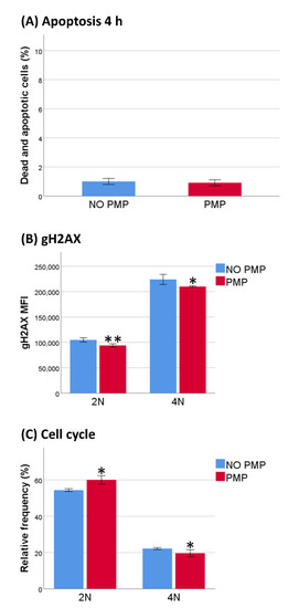 Measurement of gH2AX by flow cytometry was performed according to Darzynkiewicz et al. [75]. After PMP co-incubation, cells were fixed with 1% methanol free formaldehyde for 15 min on ice, then fixed and permeabilized in 70% ethanol, and stored overnight. Fixed and permeabilized cells were stained with FITC conjugated anti-phospho-Histone H2A.X (Ser139) antibody (clone JBW301; 1 µg/100 µL; Sigma Aldrich), and propidium iodide solution (5 µg/mL; Thermo Fisher Scientific) containing DNase free RNASE A/T1 cocktail (25 U/1000 U per mL; Thermo Fisher Scientific).