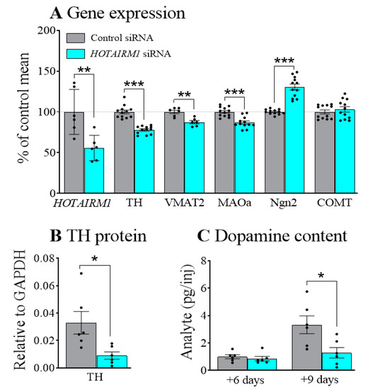 After confirming the expression of HOTAIRM1 in SHSY5Y cells and siRNA efficiency (Figure S1), we used RA to induce the differentiation of cells into DA neurons. We first knocked down the levels of HOTAIRM1 in SHSY5Y cells using siRNA against HOTAIRM1 for 24 h and then differentiated the cells for 48 h in the presence of RA (Figure 1A). We examined the levels of early DA neuronal specification markers including the LIM homeodomain gene (lmx1a) and Nurr1, and DA neuronal markers such as TH and DAT. We also assessed the factors that are involved in DA metabolism, e.g., vesicular monoamine transporter (VMAT2) and an enzyme responsible for the intraneural metabolism of DA, monoamine oxidase (MAOa). Aldehyde dehydrogenase-1a1 (AHD2), an enzyme only expressed in DA neurons within substantia nigra [13] was also examined. Our results showed that attenuating HOTAIRM1 (F1,10 = 11.8, p < 0.01) reduced the expression of TH (F1,22 = 70.4, p < 0.001), VMAT2; (F1,11 = 18.7, p < 0.01), and MAOa; (F1,22 = 25.7, p < 0.001). In contrast, the proneural gene that modulates neuronal differentiation, neurogenin 2 (Ngn2), was increased after HOTAIRM1 attenuation (F1,22 = 66.9, p < 0.001). Catechol-O-methyl transferase (COMT), a key enzyme in dopamine metabolism, but not expressed in DA neurons, was not affected by HOTAIRM1 attenuation. Levels of lmx1a, Nurr1, DAT, and AHD2 were extremely low, but similar profiles were observed (Figure S2).